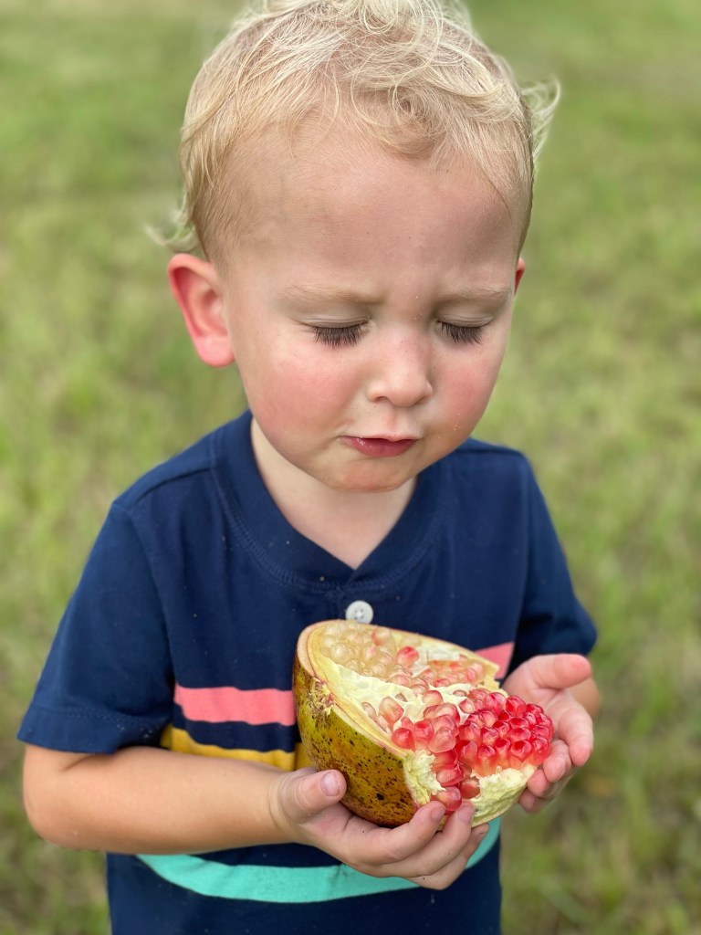 Micah enjoying a tart pomegranate from Bennett’s orchard.